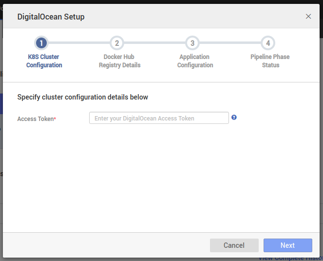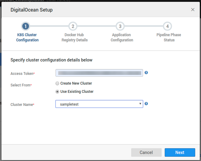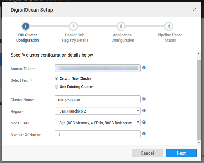 After choosing the DigitalOcean cloud provider, you observe a configuration dialog comprising of multiple steps. Let's talk in detail about each step below.