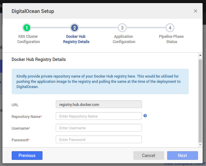 registry.hub.docker.comas we are supporting only the docker hub registry for now. - Repository Name: To enable only private push and access of images, you should provide a private repository name. To create a private repo in Docker Hub account, see Private repositories.
