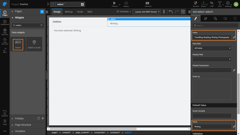 - The simplest way to use the Select Widget is to enter the values in a comma-separated format for display in the Value property under the DATASET section. In this example, we have set the value to Travelling, Reading, Writing, Photography.