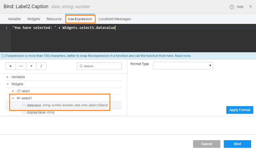 - The selection made by the user is displayed in a Label widget, by binding the select datavalue to it.