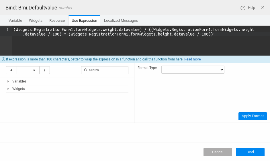 - Click on bind icon and add the logic as below. If the country is US then apply one set of display formats else other display format while entering phone number.