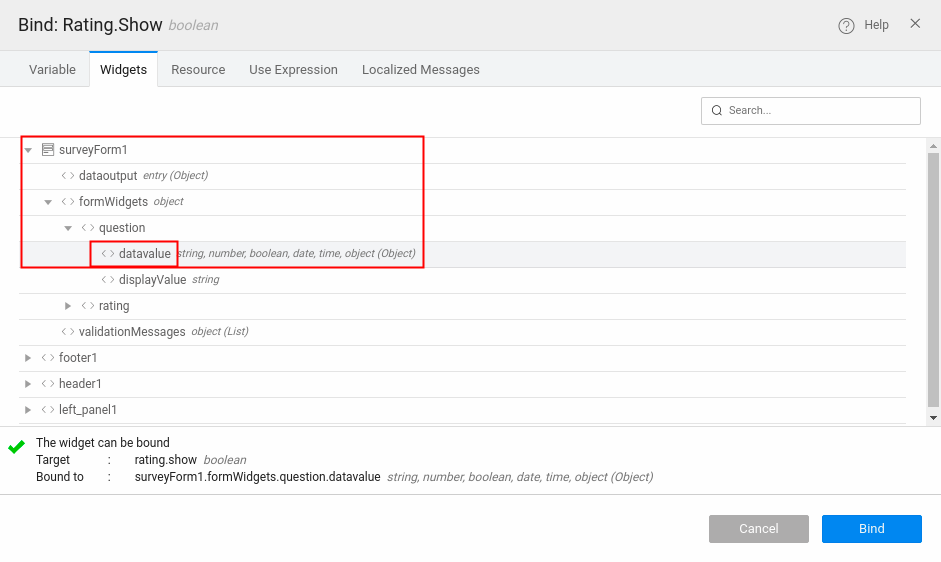 - Select the Widgets tab in binding dialog, select the question field datavalue as shown in the below image.
