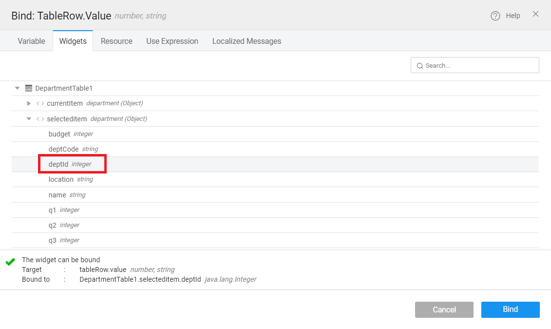 - Go to the Widgets tab → DepartmentTable → selecteditem → deptid _integer _**→ **click Bind.