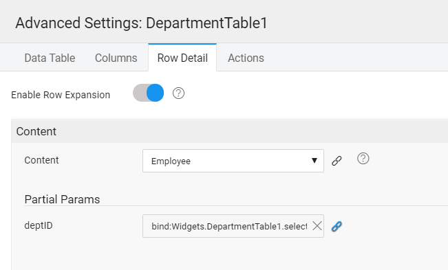 In this article, you will learn how to configure row expansion on a data table. To use the row expansion feature, you create a data table and a -->; you configure the partial to contain related information of the table item. A partial is a semi page which is a reusable object, and a data table is a data widget configured as a variable. You add page params in the partial page and bind it through the data table settings.