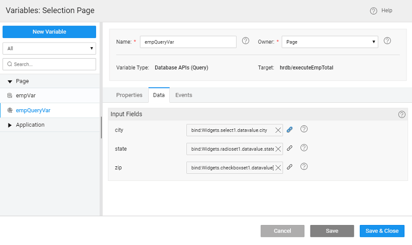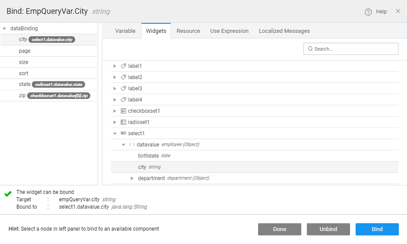 8. Bind variable data city, state and zip to the selected values of Select, Checkboxset and Radioset widgets.