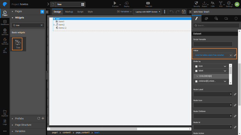 1. Next, bind the Dataset -> Value property of the tree widget to the dataset under the model variable created in the previous step (staticTree -> dataSet). You can see the preview on the canvas.