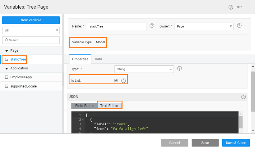 2. Create a Model Variable, say staticTree, giving the structure of the data to be displayed in the tree. Ensure that the IsList check box is selected.