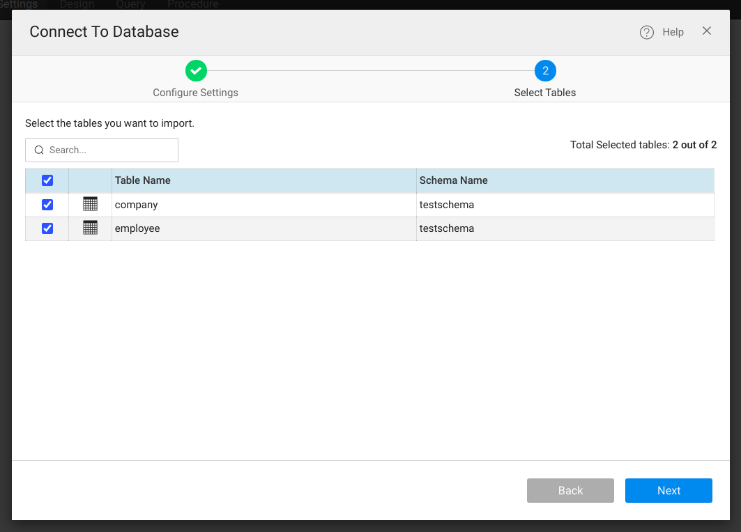 Select the desired tables to be imported and click on the Next button. This will now automatically generate the CRUD APIs for the select entities. The imported tables can be viewed from the DB designer.