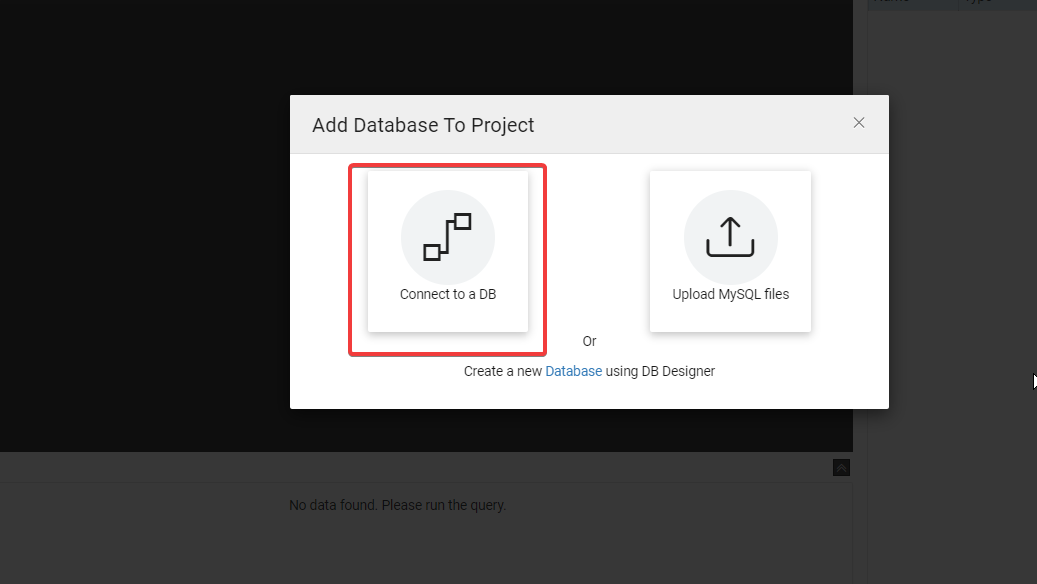 - Navigate to the Databases section and click on the plus icon to add the Database to the project. From the popup, choose Connect To a DB option.