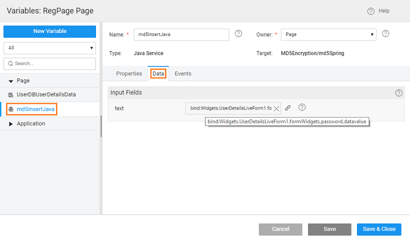 To ensure that the password field is secure, it is advisable to store it in an encrypted format. For this, we will use an md5 code to encrypt the password entry before passing it onto the live variable for insert into the database table.