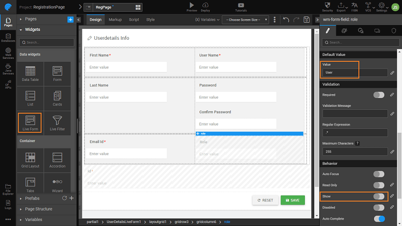 Drag and drop a Live Form widget, use the Database CRUD from the UserDB service and the UserDetails table and set the properties, as per your app requirements. We have used the following settings: