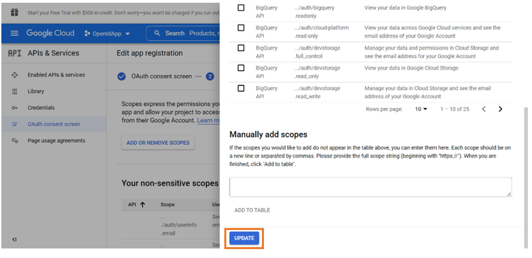 5. Check the necessary attributes as scopes and click Update.