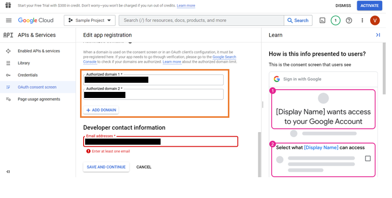 3. Provide the App name, User support email, Application Logo, Authorized domains, and Email address of the developer. Click Save and Continue.