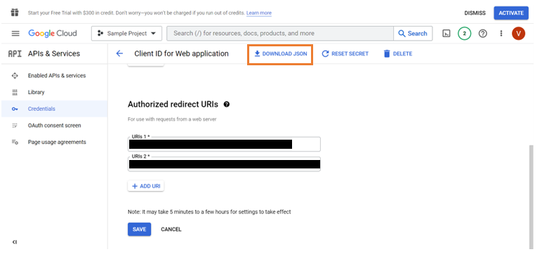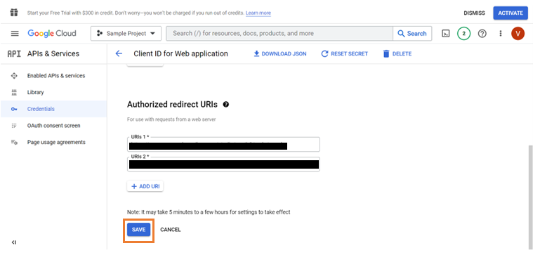 1. In the Credentials section, enter the Authorized redirect URIs and click Save.