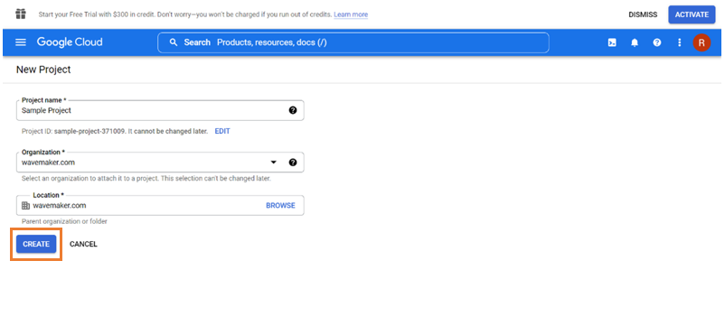 2. Enter the Project name, Organization name, and Location. Click Create to launch a new project.