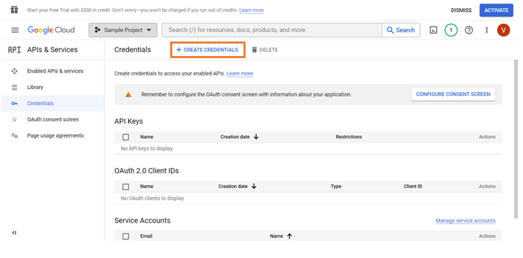 1. Click Create Credentials to select the type of credentials to access the application.