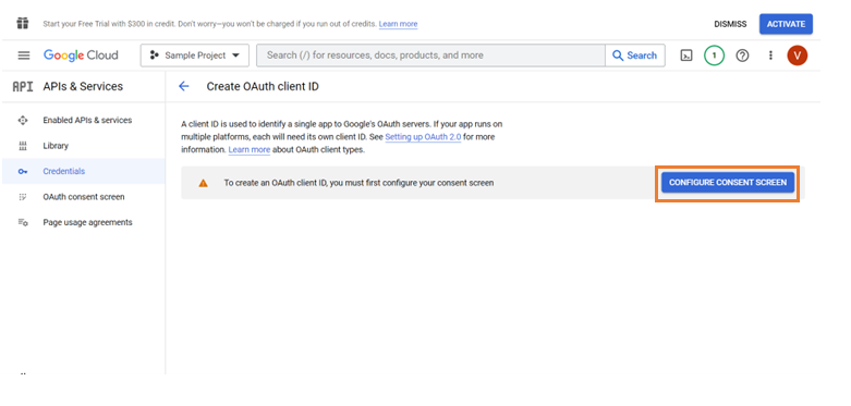 3. Click Configure Consent screen to get directed to OAuth consent screen where we add user type, scope and developer details.