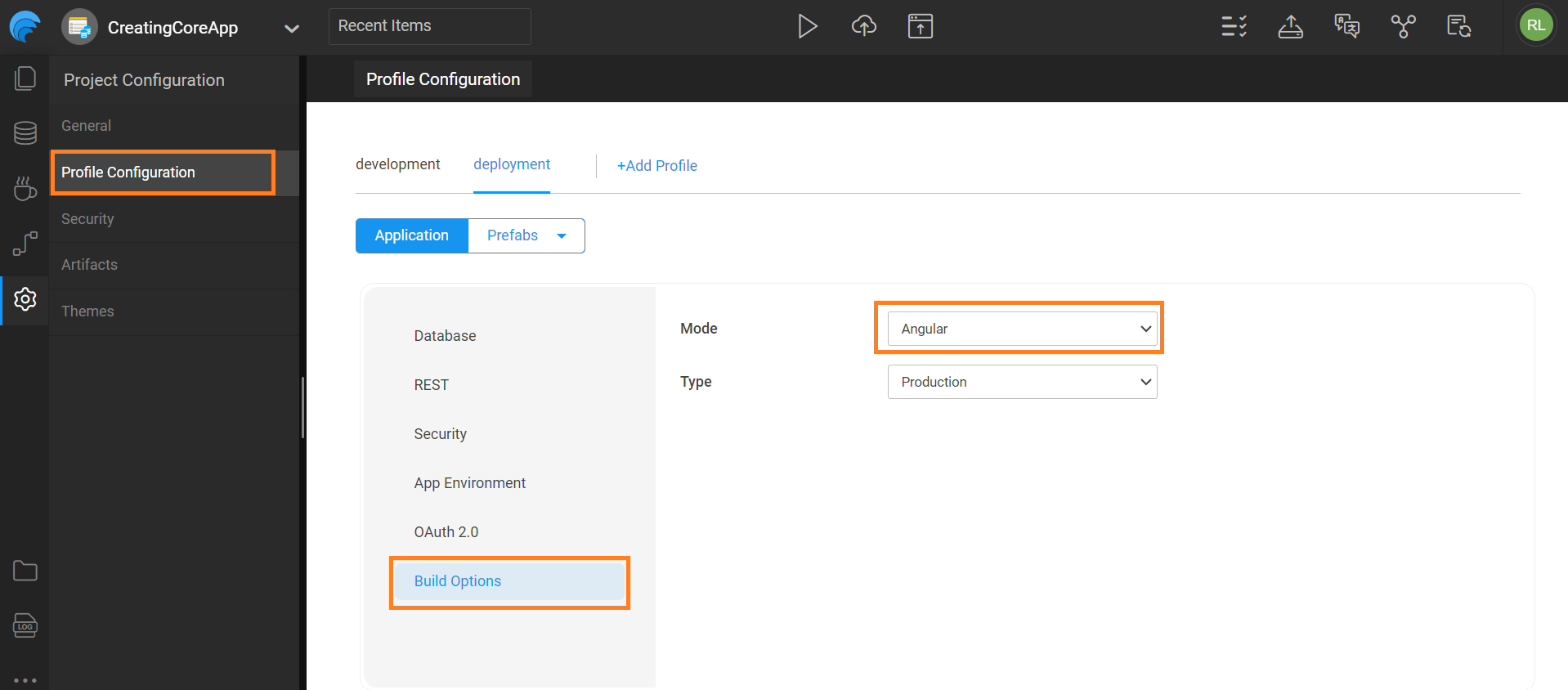 - Next, go to Settings > Profile Configuration. Switch to deployment and navigate to Build Options to set the build mode to Angular.
