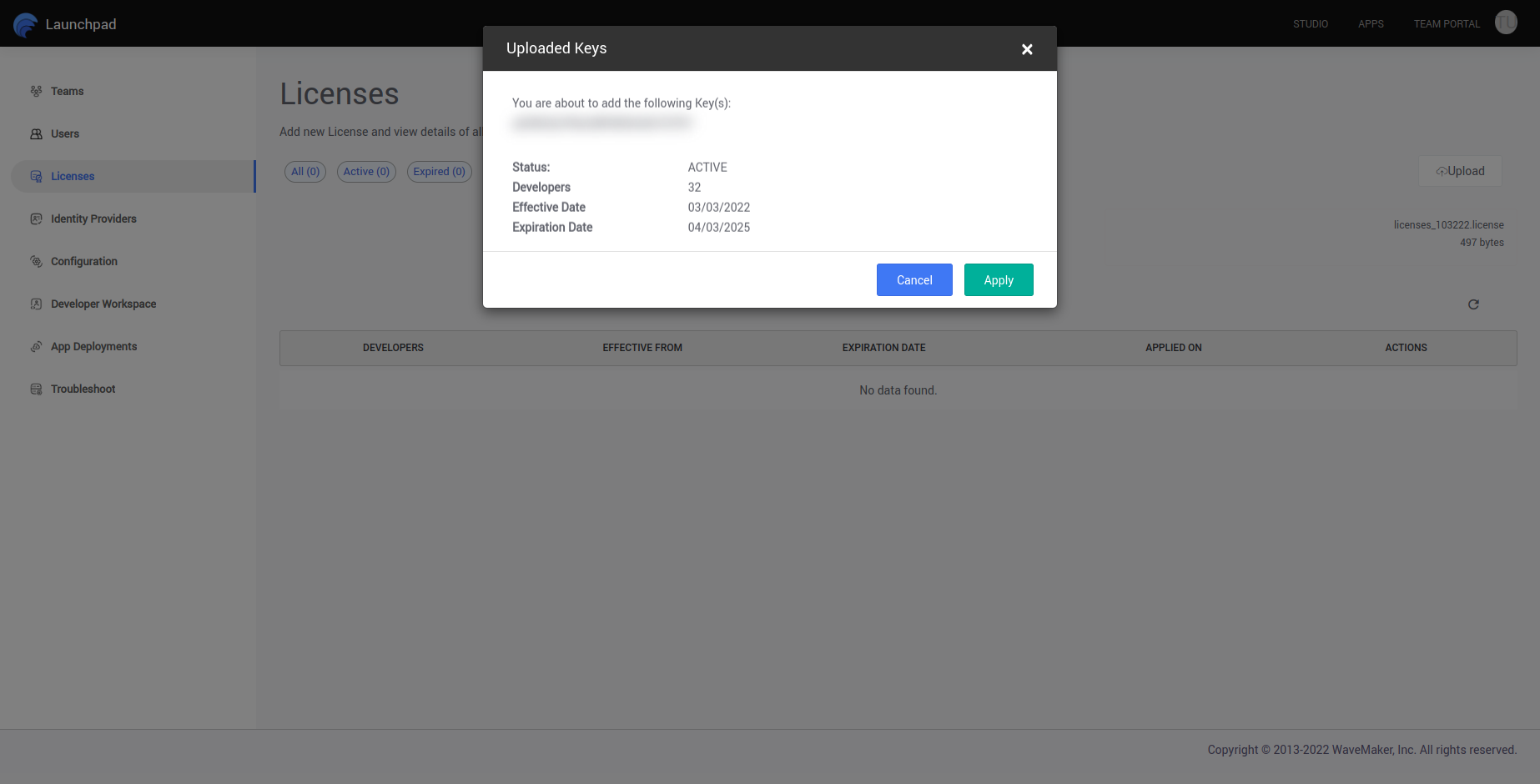 offeringswmeInstallationCommon StepsApply LicenseOn this pageApply LicenseApplying license from Launchpad Go to http://PLATFORM_DOMAIN/launchpad. At license section, select the Upload to upload license key file shared by WaveMaker team. After uploading file select upload keys to apply the license key.