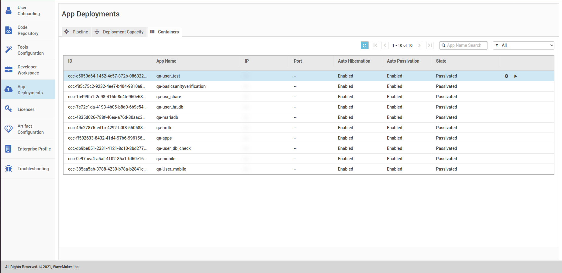 - After hibernate all the containers, go to Developer Capacity and hit the Passivate button shown in the below image. This will passivate all the Hibernated containers in the Instance.