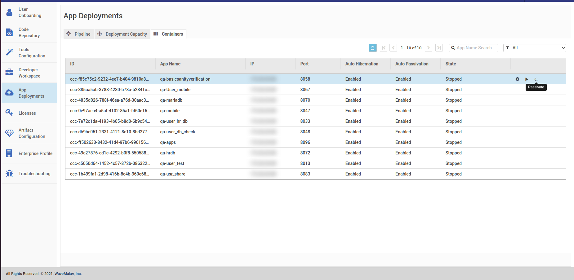 - Wait till the state is changed to stop as shown in the image below. After the container state changes to stop, you can passivate them by hitting the passivate button.