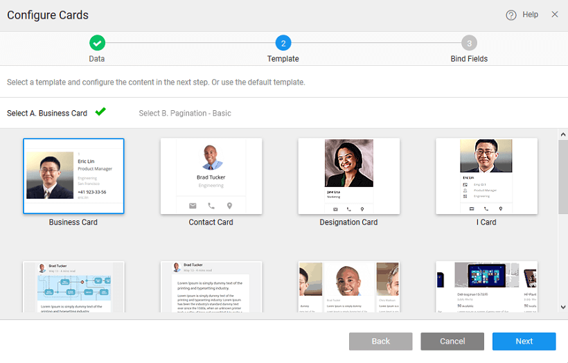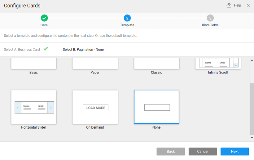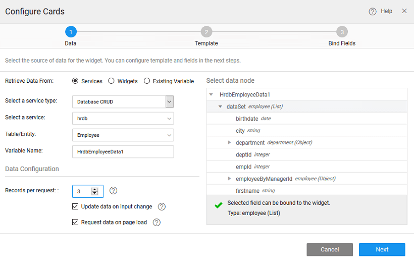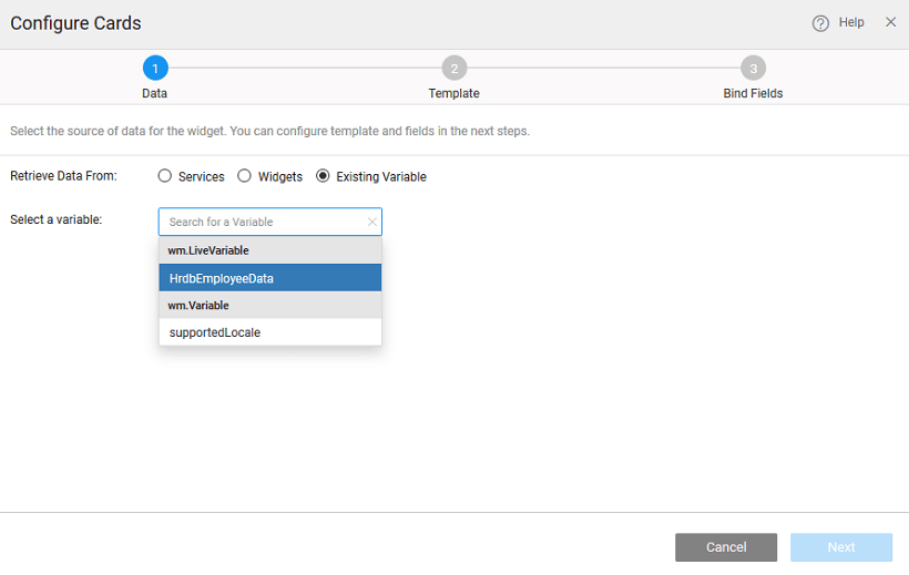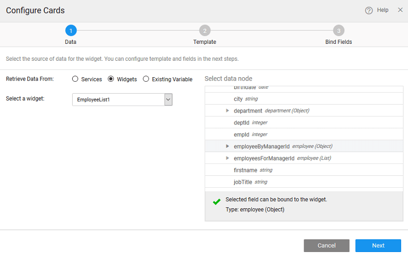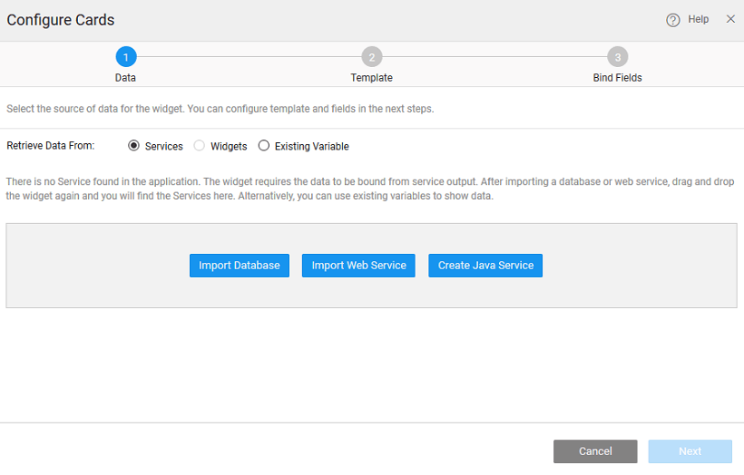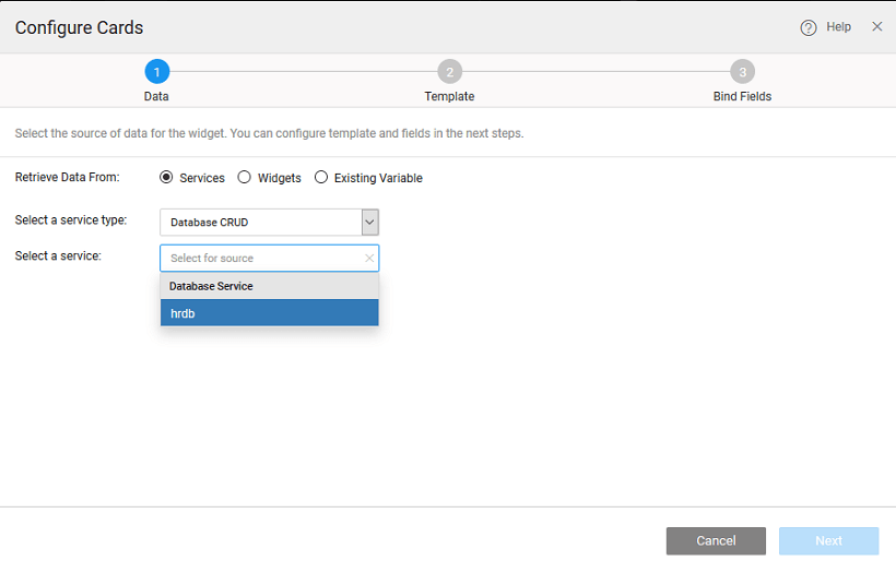 There can be different scenarios to deal with when configuring your Cards Widget with a data source. The data source can be in the form of a service - database, web or Java; or from an another widget on the page.