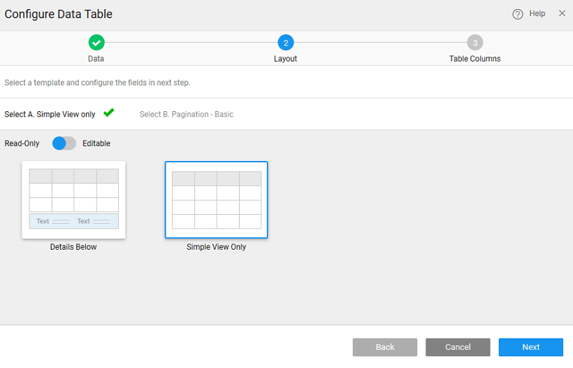 If you select the Data Table layout without Form in step 2, the Done button appears after this step. Click the Done button to add the Data Table to the current page. If you select other layouts, then additional two steps to do include select the Form layout and select the Form fields.