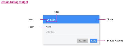 Design Dialog gives a Form for obtaining additional information from the user, like the name. It is a composite widget with Labels and Text widgets. It comes with two buttons **Cancel **and Save.