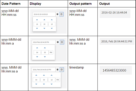 Output FormatDefines the format of output datavalue returned by the date time widget. Default output format is 'timestamp', which returns the equivalent timestamp integer. E.g timestamp value for '2012-12-12 12:12 PM' is '1355294520000'. If the output format is given as 'yyyy-MM-dd hh:mm a', widget returns datavalue as '2012-12-12 12:12 PM'.