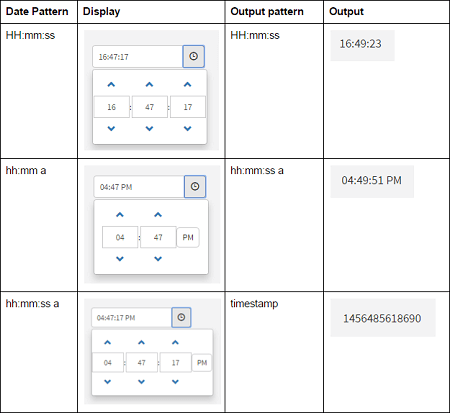 Output FormatDefines the format of output data value returned by the time widget. Default output format is 'timestamp', which returns the equivalent timestamp integer. E.g timestamp value for '10:10:00 AM' is '16800000'. If the output format is given as 'hh:mm a', widget returns data value as '10:10 AM'.