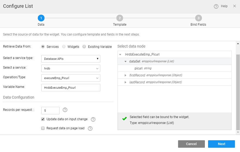 - Drag and drop a List onto the canvas space, select the data source to the dataset of the Emp_Picurl query variable created in the first step and set the layout to Media List.