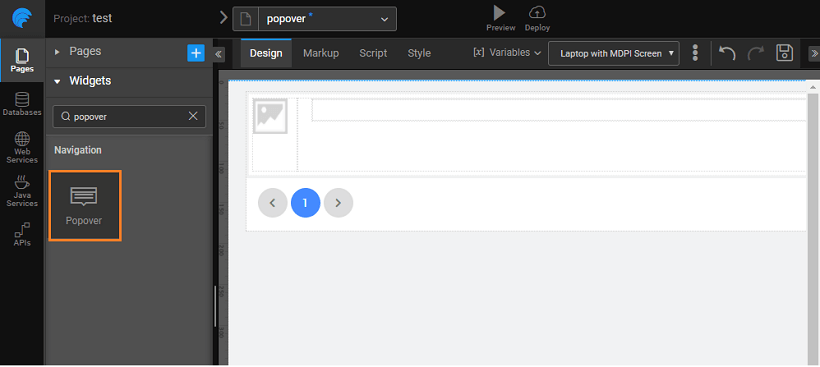 - Open the page where you want to have the popover, drag and drop the popover widget.