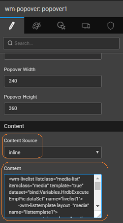- Set the content source property to the partial and the content as popover page created in the previous step and bind the badge value to the Emp_Count value. Content defines the page to be displayed when the popover link is clicked and badge indicates the number of items that will be displayed in the content.