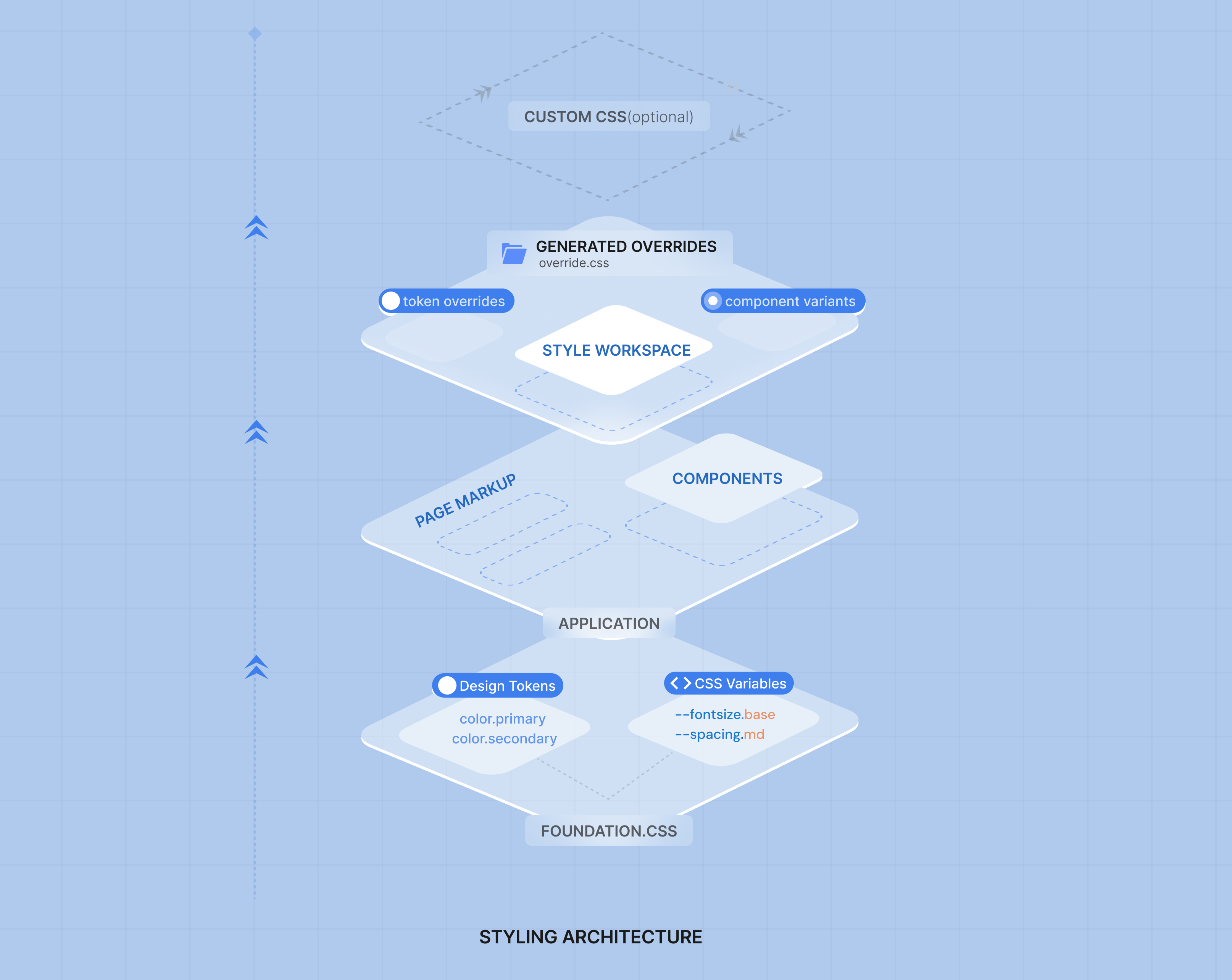 Styling in a Design System project is structured into distinct layers that build upon each other to create the final visual output of the application. Each layer serves a specific purpose in the styling architecture, allowing for a clear separation of concerns and enabling both consistency and flexibility in design.